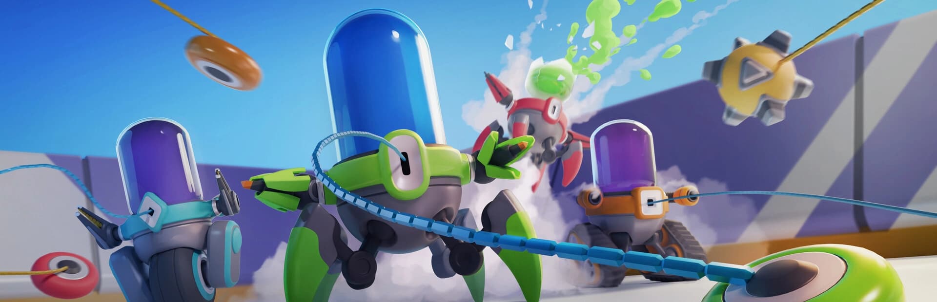 Join the fight in a compact arena, split in half by the Divisor! Use the Gripper to pull enemy robots from the other side and finish them off with your teammates. Feeling Rambo? Launch yourself to the enemy side and die WIPE THEM OUT!